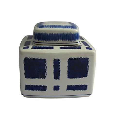 Benzara Block Patterned Decorative Ceramic Covered Jar, Blue/White