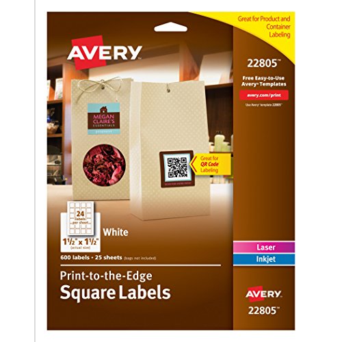 Avery Permanent Square Label, White, Inkjet/Laser 1.5 x 1.5-Inches, Pack of 600, Use for QR Codes and Branding Your Packaging (22805)