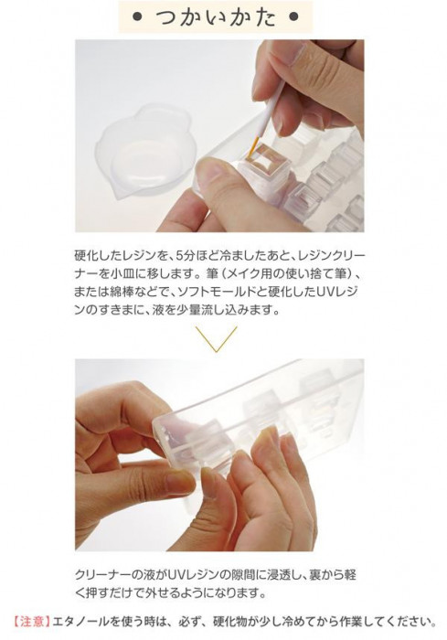 硬化前のレジン液のクリーナーとして大活躍!!硬化後、モールドとレジンのすきまに流し込むことによって型を傷めずに外すこともできます。レジンクリーナーを使う事で、型離れが良くなり、未硬化のUVレジンも掃除できるので一石二鳥です。 |