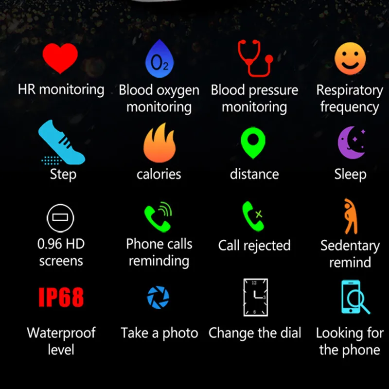 Function:Week,Message Reminder,Passometer,Activity Tracker,Alarm Clock,Blood Oxygen,Fitness Tracker,Blood Pressure,Call Reminder,Calendar,Remote Control,Sleep Tracker,Heart Rate Tracker,Social Media Notifications,Push Message