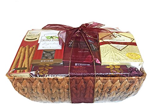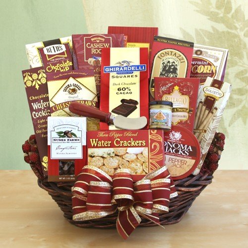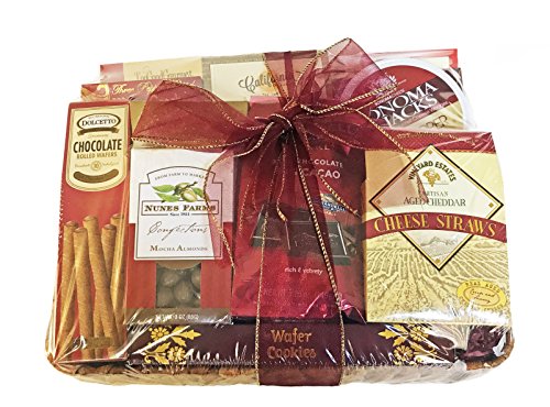 -. Feature : Ghirardelli dark chocolate squares, Sonoma cheese straws, Napa Valley mini mustard, mocha almonds, water crackers, cheese / Water crackers, cheese, Dolcetto cookies, hot cocoa mix, chocolate wafer cookies, chocolate chip cookies / Cashew Roca, butter toffee pretzels, English tea cookies, peppermint popcorn and a wooden cheese knife / Great gift basket for anytime of the year / Include a personalized gift message for your clients, friends, and loved ones.