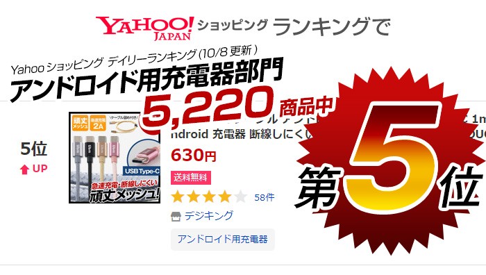 新しいスマホはどんどんUSB Type-Cに変わっています。予備のケーブルが手元にない、そんな方に!断線しにくいメッシュ被覆、急速充電2AのUSB Type-Cケーブルが登場!【特徴】●急速充電対応2Aで、充電待ちの無駄を解消!●断線やねじれに強いナイロンメッシュを使用!●USB Type-C搭載の機器(スマホ/タブレット/MacBook/MacBook Proなど)で使える!●日常で使いやすい1mの長さ。●スマホだけでなく、タブレットも充分な速度で充電できる!●パソコンとスマホを繋げれば、データ通信も行える!●ケーブル留めが付きだから、ケーブルが絡まらず持ち運びに便利!●選べる4色のカラー デジキン