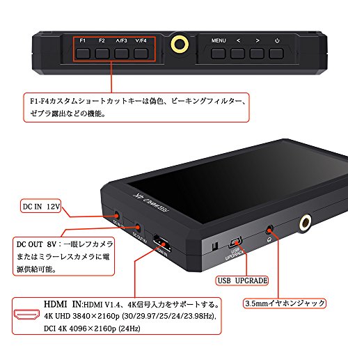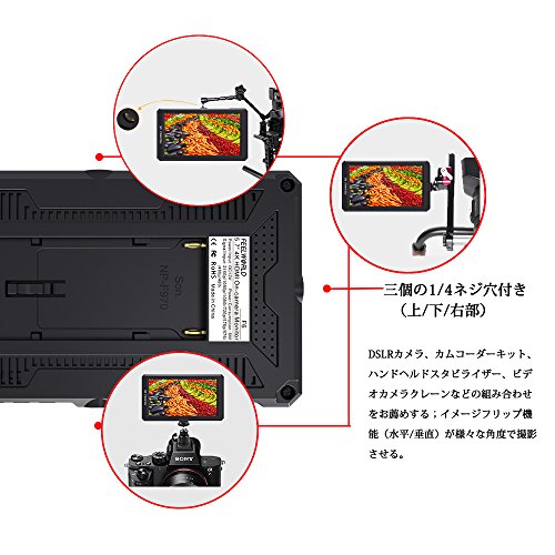 -. Feature : 【IPS 5.7インチパネル】:フルHDIPSパネル、1920x1200高解像度、1400:1高コントラスト、450cd / m2明るさ、386PPI、95%色域、REC.709プロなカラーキャリブレーション、優れた色彩還元性及び素晴らしい視覚体験。 / 【4K HDMI信号入力】 4K HDMI 信号入力可能、例えば4K UHD 3840×2160p(30 / 29.97 / 25/24 / 23.98Hz)、DCI 4K 4096×2160p(24Hz) 。 使用可能な信号フォーマットは、仕様から参照してください。 / 【プロな補助機能】ヒストグラム、ピーキングフォーカスアシスト、ゼブラ露光、カメラモード、イメージフリップ、チェックフィールド、アナモルフィックモード(1.3x、2.0x、2.0x mag)、セーフエリア(80%,85%,90%,93%,96%)、ピクセルからピクセル、イメージフリップ(H、V、H / V)、色温度調整など。 / 【カメラに電源供給可能】:一眼レフカメラまたはミラーレスカメラに電源供給(DC 8V電源出力)が可能;170度(L/R/U/D 85°)広い視野角;折り畳みサンフードが付属。 / 【スタビライザーと組み合わせ】三個の 1/4-20ネジ穴(上/下/右部)があり、DSLRカメラ、カムコーダーキット、ハンドヘルドスタビライザー、ビデオカメラクレーンなどの撮影アクセサリが取り付け可能;ティルトアームを利用してカメラに取り付けたら、モニターが180度回転可能。