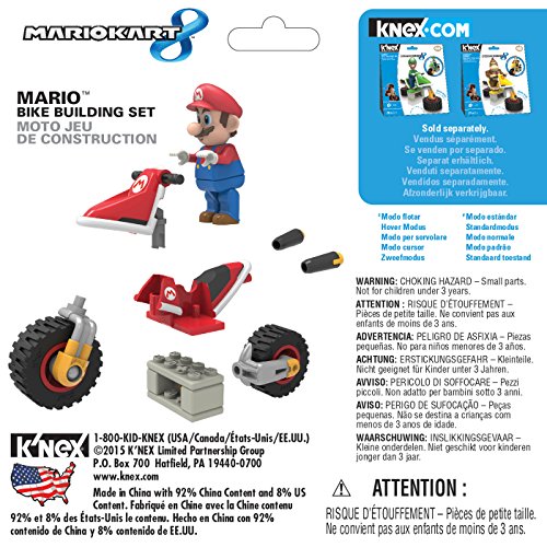 -. Binding : Toy -. Brand : K'Nex -. Color : Multi -. EAN : 0744476384942 -. Feature : Build Mario and his Standard Bike from Mario Kart 8! / Bike transforms into hover mode - just like the game! / Re-usable ramp package / 15+ K'NEX building parts / Recommended for builders ages 6+ -. IsAdultProduct : 0 -. ItemPartNumber : 38494 -. Label : K'NEX -. Manufacturer : K'NEX -. Model : 38494 -. MPN : 38494 -. PackageQuantity : 1 -. PartNumber : 38494 -. ProductGroup : Toy -. ProductTypeName : TOYS_AND_GAMES -. Publisher : K'NEX -. ReleaseDate : 2015-07-01 -. Studio : K'NEX -. Title : K'NEX Mario Kart 8 Mario Bike Building Set -. UPC : 744476384942 -. Warranty : Lifetime warranty against manufacturer's defects