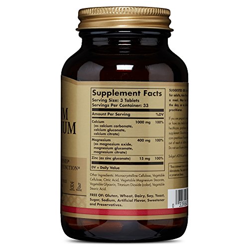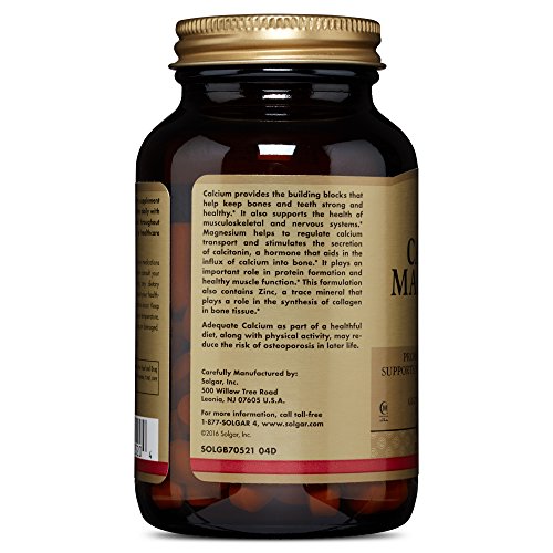 -. Feature : HOW CALCIUM HELPS: Calcium provides the building blocks the body needs to help keep bones and teeth healthy and strong. The health of musculoskeletal and nervous systems are also supported. This comes in a highly absorbable calcium citrate form / HOW MAGNESIUM HELPS: Magnesium works with ATP (Adenosine Triphosphate) to release the energy needed for many reactions within the body. It also plays an important role in protein formulation and healthy muscle function / ADDED ZINC BENEFITS: The combining of calcium and magnesium these in Solgar tablets is that in addition to the ways the body benefits from each of these ingredients, magnesium helps to regulate calcium transport and aids in the influx of calcium into bone. This formulation contains the trace mineral, Zinc, which plays a role in the synthesis of collagen in bone tissue / SUITABLE FOR VEGANS: All capsules are non-GMO and certified gluten free. They are also free of wheat, dairy, soy, yeast, sugar, sodium, artificial flavors, sweeteners, preservatives and colors