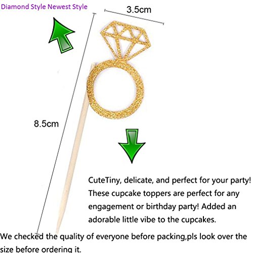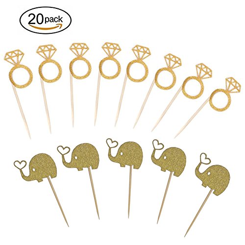 Kakasogo 10 PCS Diamond Ring +10Pcs Elephant Gold Glitter Cupcake Toppers Cake Picks for Wedding Bridal Marriage Engagement Anniversary Birthday Valentines Party Baby Shower Food Decoration