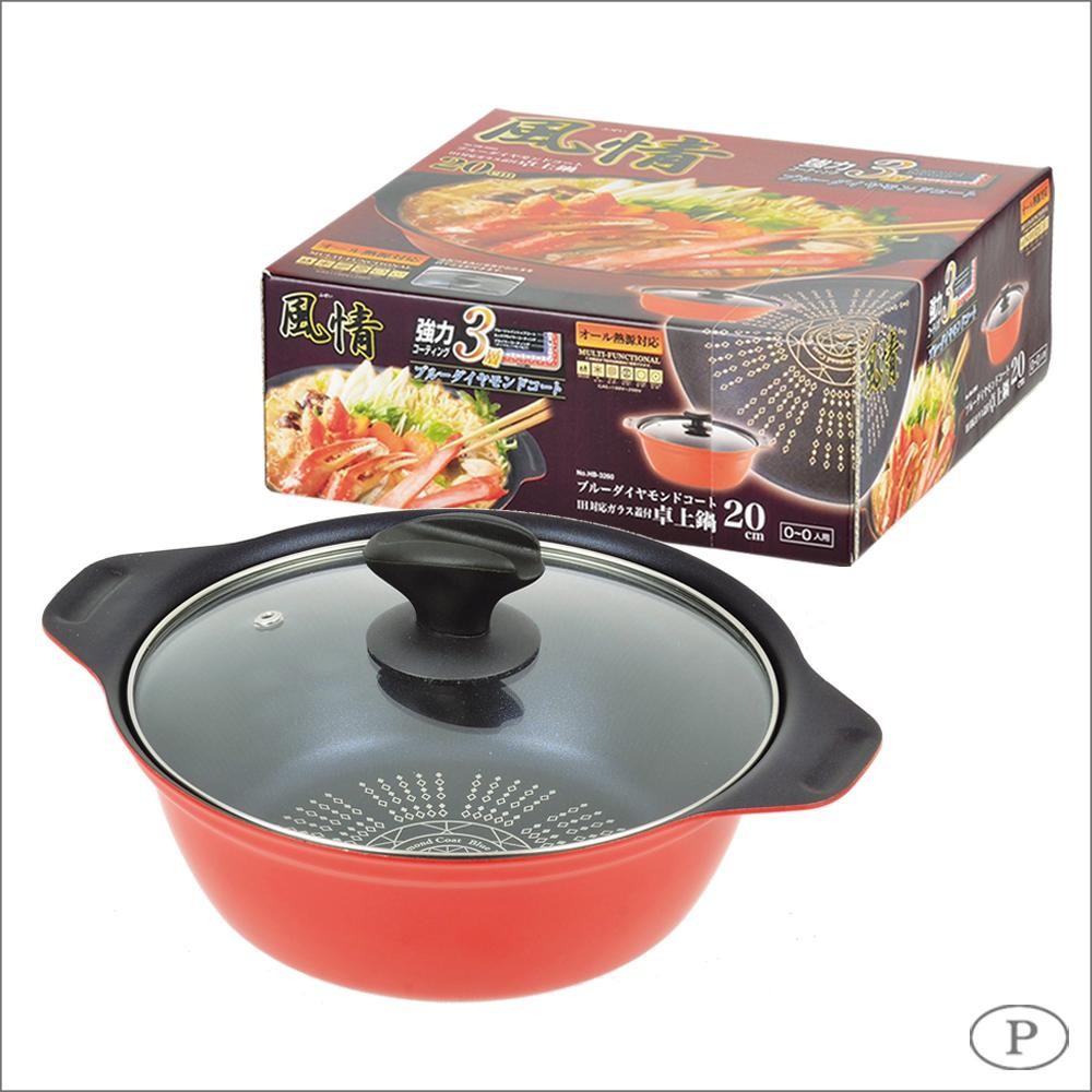 | 強力3層コーティングが施されたガラス蓋付卓上鍋。蓋のつまみに菜箸やおたまを置くことができます。オール熱源対応。 |