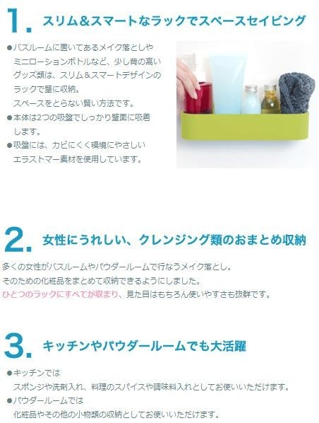 | バスルームに置いてあるメイク落としやミニローションボトルなど、少し背の高いグッズ類は、スリム&スマートデザインのラックで壁に収納!!スペースを取らない賢い方法です。 |