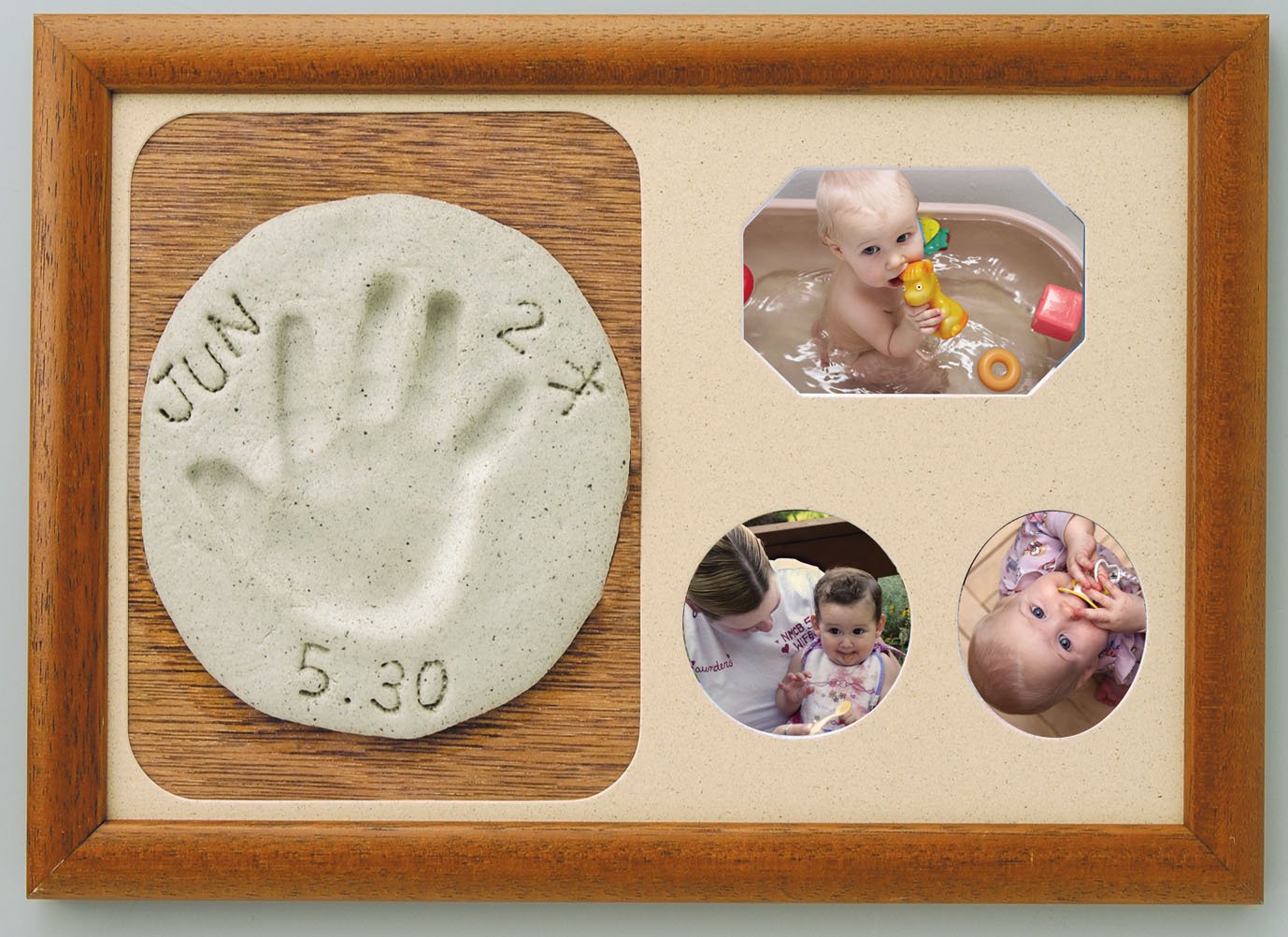 Just picking the handprints and footprints on the clay, baking in the oven toaster, the finished relief like a stone.