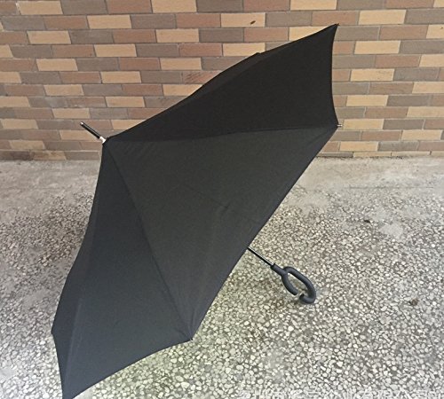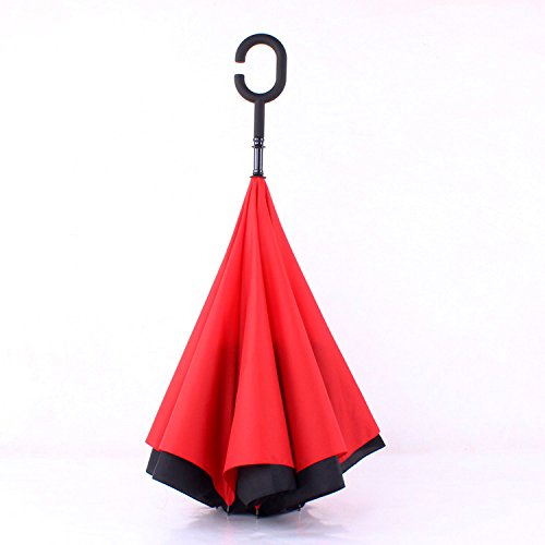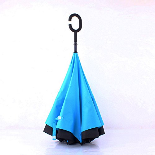 -. Feature : ☂ DURABLE MATERIALS☂:Should the wind come along and attempt to invert your umbrella, it will be thwarted by the fact that it is already inverted / ☂ DOUBLE LAYER DESIGN ☂:Rain water is neatly collected in this cup-like shelter and runs down the center of the pipe via an inlet in the environmentally-exposed section / ☂ STAND UP ON ITS OWN ☂: Perfect design to make it stand up totally on its own when closed, but not held tight by the velcro close strap, saving much space. / ☂LIFETIME REPLACEMENT GUARANTEE ☂:Upon collapsing inverted umbrella, its dry side is exposed while its wet side faces inward, sequestering the water temporarily to keep it from going everywhere / ☂HANDS FREE HANDLE ☂: The C-shaped hand grip allows you to play with mobile phone when you hold the reverse windproof umbrella with your wrist and lift a bag in the rain, making it convenient for mothers to hold the umbrella when they have baby in arms.