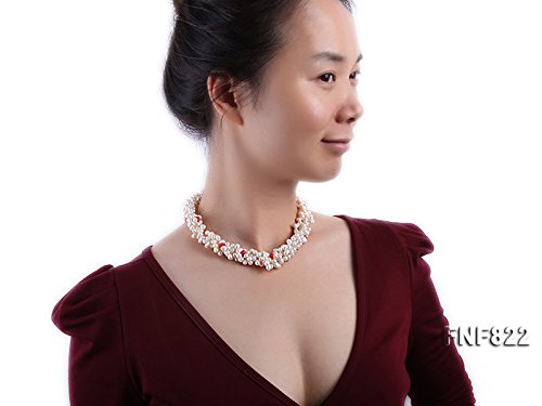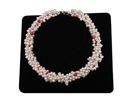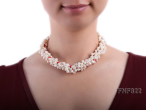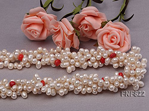 Description *TLovely four-strand necklace made of 4.5-6.5mm white oval side-drilled cultured freshwater pearls and 4.5mm red coral beads.