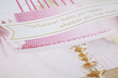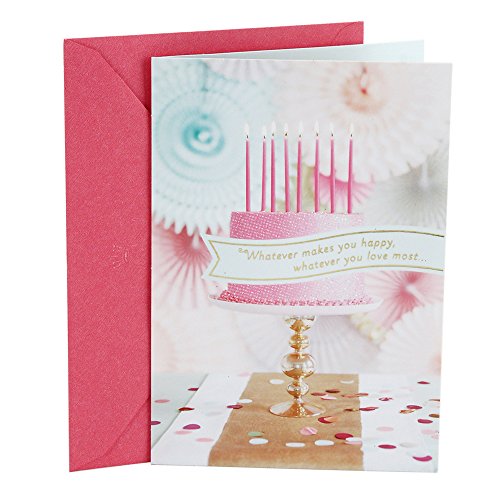 Studio : Hallmark Marketing Company, LLC (Office) Publisher : Hallmark Marketing Company, LLC (Office) Binding : Office Product Product Description Reach out with a warm greeting to your friends with this card, featuring a still life photo of a pink cake with candles presented on a gold stand on a confetti-covered table with cockades in the background. The message on the front of the card reads, "Whatever makes you happy, whatever you love most...." Open the card to reveal the inside message, "...that's my wish for you!" The card measures 7.2 inches long by 5 inches wide made with high quality cardstock paper; an envelope is included. All Hallmark cards are made with paper from well-managed forests. Hallmark was founded in 1910 when 18-year-old J.C. Hall arrived in Kansas City, Missouri, with a couple of shoeboxes of postcards under his arm and the American dream in his heart. Hallmark greeting cards are sold online and in nearly 40,000 retail stores across the globe and people continue to recognize the iconic Hallmark brand as "the very best." 0