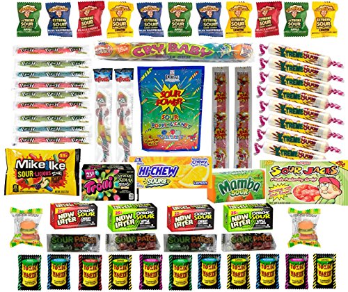 -. Feature : The BEST variety for all sour candy lovers! / Contains 60 Individual packages of sour candy. / Brands Include: Warheads, Sour Punch, Cry Baby, Smarties EXTREME Sour, Sour Power, efrutti, Mike & Ike, Trolli, Hi-Chew, Mamba Sour, Sour Jacks, Now & Later EXTREME, Sour Patch Kids, Toxic Waste / All products come repackaged in a clear plastic bag and are guaranteed fresh.