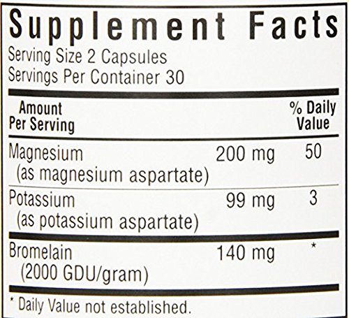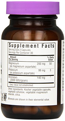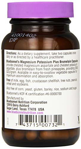 ReleaseDate : 2015-05-28 Studio : Blue Bonnet Publisher : Blue Bonnet Binding : Health and Beauty Product Description Bluebonnet's Magnesium Potassium Plus Bromelain Capsules provide chelated magnesium aspartate and chelated potassium aspartate, plus bromelain from fresh pineapples, providing 2000 GDU/gram. Available in an easy-to-swallow vegetable capsules for maximum assimilation and absorption. This product is vegan friendly, gluten free, and kosher. 0