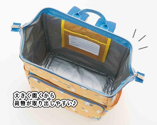 ファスナー式で開けやすい、がま口型のリュックです。開閉口が大きく開き、荷物の出し入れもラクラク♪ポケットもついていて小物入れに便利です!! |