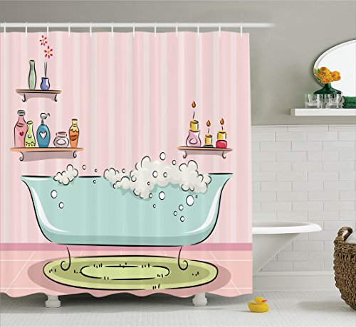 Ambesonne teens girls women decor Collection, Illustration of Bathtub with Bubbles in Girly Room Aroma Oil Lamps Aromatherapy, Polyester Fabric Bathroom Shower Curtain, 75 Inches Long, Pink Blue