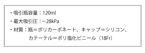 ●材質:瓶=ポリカーボネート、キャップ=シリコン、カテーテル=ポリ塩化ビニール(18Fr)