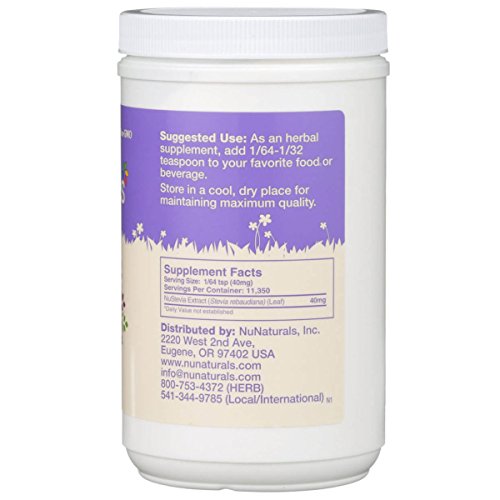 -. Feature : NATURAL SWEETENER - Totally natural and perfectly sweet, NuStevia White Stevia Pure Extract is made with only the highest grade of Stevia extract available, selected for purity, sweetness and superior flavor with no bitterness or unpleasant aftertaste. / SUPER CONCENTRATED - This pure extract of Stevia leaves is our most concentrated form, requiring only a tiny amount. A pinch is as sweet as 2 tsp. of sugar! Great for mixing up large batches of beverages or recipes. / EASILY DISSOLVES - No excessive stirring, heating, or crunching through stubborn sugar granules. NuStevia White Stevia Powder natural sugar substitute dissolves instantly in your coffee, tea, cereal, yogurt, fruit, or anything that needs sweetening. / ZERO CALORIES AND NO JUNK - NuStevia White Stevia Pure Extract gives you amazing, sweet taste with zero calories. This plant-based, diet-friendly is also a Vegan, Gluten Free and GMO Free food. / TO KEEP YOU WELL - Providing healthy, plant-based products for over 26 years, NuNaturals aims to keep you well, build "sweet" relationships, and make you smile!