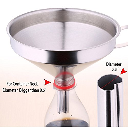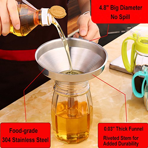 The funnel was mdae of food-grade 304 Stainless steel, easy to wash in water or dishwasher. The heavy duty stainless steel is as thick as 0.03 inch; it is extremely sturdy with the riveted stem for added durability.