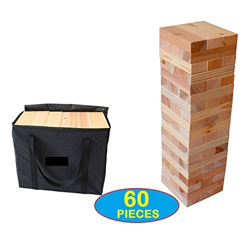 Giant Tumbling Timbers includes 60 - 2x3 pieces and 20 rows of tumbling timbers fun! This timber game stands 2.5 feet tall and depending on your level of experience can reach a height of 5 feet! This game is great to take outdoors. Perfect for group events, parties, camping and more. Tumbling Timbers can be played by 2 or more players. First, build the tower, then take turns to remove a block using only one hand and place on the top. The object is to be the last player to successfully stack a wooden block without knocking down the tower. This set is made with beautifully crafted undercoated solid wood and is hand cut and sanded for smooth game play. Please note that the bottom level only has two timbers to begin, using 60 timbers allows for the easiest packing arrangement. Suitable for 2 or more to entire family to play.Feature