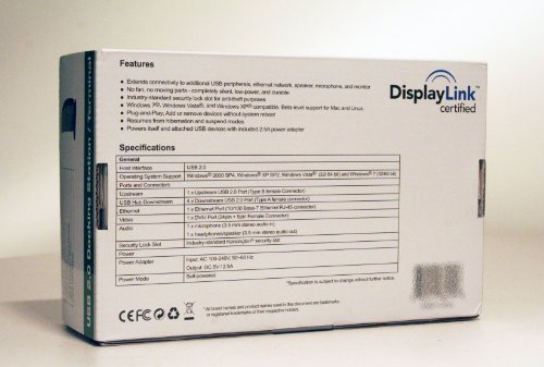 - Feature : Use with any PC to add an extra display up to 1920x1080, speakers, ethernet, and 4 USB ports / DVI/VGA connector, 10/100 Ethernet RJ-45, 3.5 mm plugs for stereo speaker and mic, security slot / Simple and small with no moving parts, no fans, all standard USB 2.0. Does not charge laptop / Windows 8.1/8/7 32/64 and XP 32-bit drivers via Windows Update, download, or disk / Mac is not supported due to significant limitations in the operating system. Linux beta-quality drivers available but with important limitations--details below