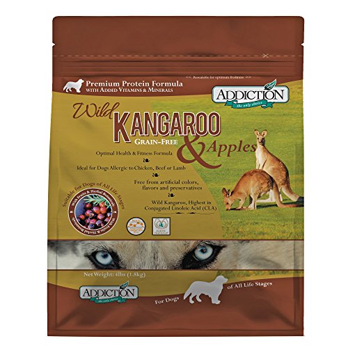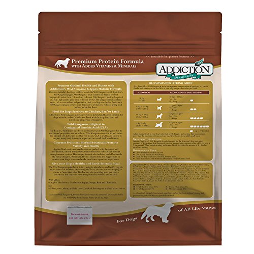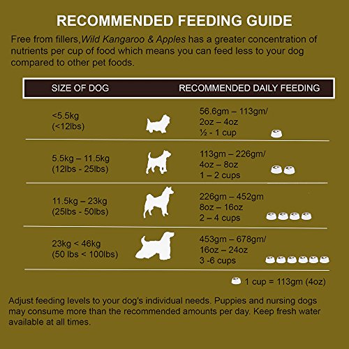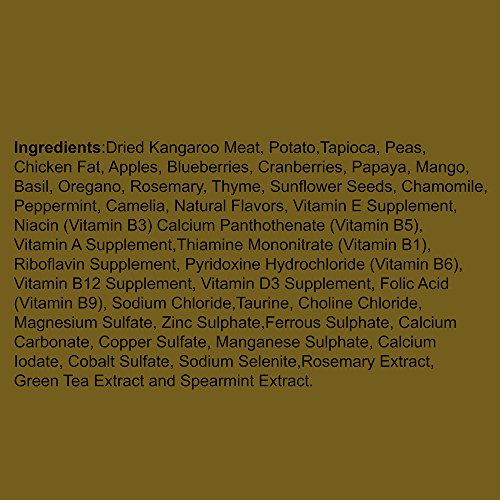 原材料:ドライカンガルー、ポテト、タピオカ、エンドウマメ、鶏脂肪、リンゴ、ブルーベリー、クランベリー、パパイヤ、マンゴー、バジル、オレガノ、ローズマリー、タイム、サンフラワーシード、カモミール、ペパーミント、ツバキ、天然香料、ビタミンE、ナイアシン、パントテン酸カルシウム、ビタミンA、チアミン、ビタミンB1、リボフラビン、塩酸ビリドキシン、ビタミンD12、ビタミンD3,葉酸、塩化ナトリウム、タウリン、塩化コリン、硫酸マグネシウム、硫酸亜鉛、硫酸第一鉄、炭酸カルシウム、硫酸銅、硫酸マンガン、ヨウ素酸カルシウム、硫酸コバルト、亜セレン酸ナトリウム、ローズマリーエキス、緑茶エキス、スペアミント・エキス