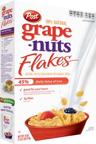 -. Feature : Pack of five Post Grape-Nuts Flackes 18 ounce boxes / Whole grain, 23g per serving Nutritionists recommend eating 3 or more servings of whole grain foods per day (about 16g whole grain per serving or at least 48g per day). / Good source of fiber, 3g per serving / Low in fat, 0g Trans Fat, and Cholesterol free / Provides 10 essential Vitamins and Minerals