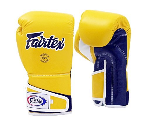 -. Binding : Misc. -. Brand : Fairtex -. Feature : Hand made in Thailand with top grain leather. / Super contoured hand compartment & precurved thumb. / Extended wrist padding for increased protection against punches and kicks. / Triple-layer latex foam core for the heavy impact absorption. / Free Shipping upgrade. Gloves shipped Express with standard shipping cost. Service center is in the U.S. -. IsAutographed : 0 -. IsMemorabilia : 0 -. Label : Fairtex -. Manufacturer : Fairtex -. ProductGroup : Sports -. ProductTypeName : SPORTING_GOODS -. Publisher : Fairtex -. Studio : Fairtex -. Title : Fairtex Stylish Angular Sparring Gloves BGV6 Color: Black Red Yellow White Orange Marina Blue Size: 12 14 16 oz.