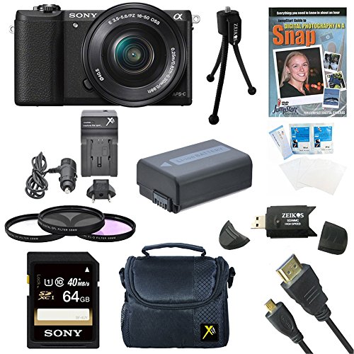 Sony a5100 ILCE5100L/B ILCE5100L ILCE5100 ILCE5100lb 16-50mm Interchangeable Lens Camera w/ 3-Inch Flip Up LCD (Black) Bundle w/ Sony 64GB Class 10 SD card, Spare Battery, Rapid AC/DC Charger, + More