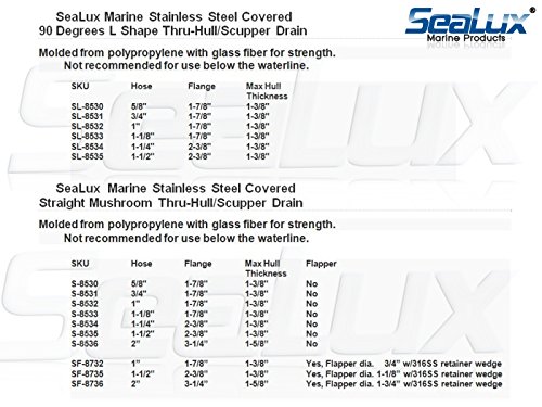-. Feature : SeaLux Marine 90 degree L-Shape Thru Hull/ Scupper With 316 Stainless Steel Trim Cover, / with Highly Mirror Polish 316 SS Trim Cover . / Molded from polypropylene with fiber glass for strength. / Not recommended for use below the waterline.