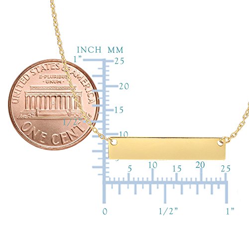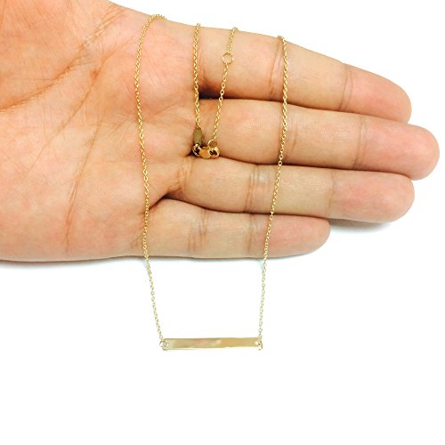 Modern and simple at the same time, this 14K gold solid bar pendant can be completed by your custom engraved name making it a fine statement necklace. This straight horizontal bar pendant is suspended on both ends of its delicate yet durable 18 inch oval cable link chain, secured with a spring ring clasp.Feature