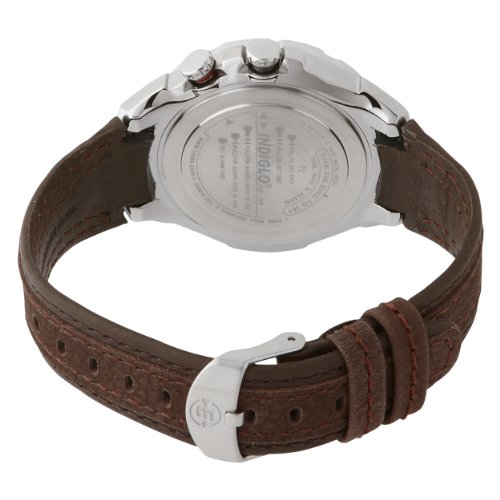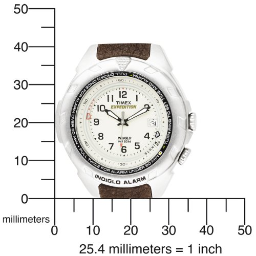 Amazon.com Product Description Designed for active, outdoor lifestyles--as well as the rigors of harsh urban landscapes--the full-sized Timex T47902 Expedition stainless steel men's watch adds a stylish yet rugged complement to your everyday wear. It features a large silver stainless steel bezel with machine cut highlights that frames an interior dial with 10-minute markings, a cream dial with full Arabic numeral display, luminous stick hands (with seconds hand), and date display at 3 o'clock. It also offers an easy set alarm function, 7.5-year battery life, water resistance to 50 meters (165 feet), and a tapered brown leather strap with nylon accents. The Indiglo night-light uniformly lights the surface of the watch dial using patented blue electroluminescent lighting technology. It uses less battery power than most other watch illumination systems, enabling your watch battery to last longer. 0