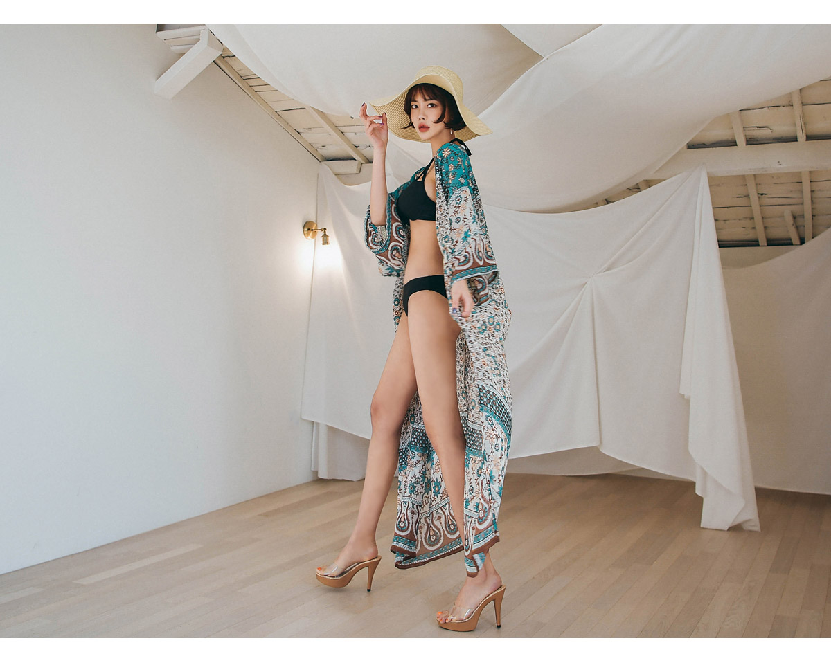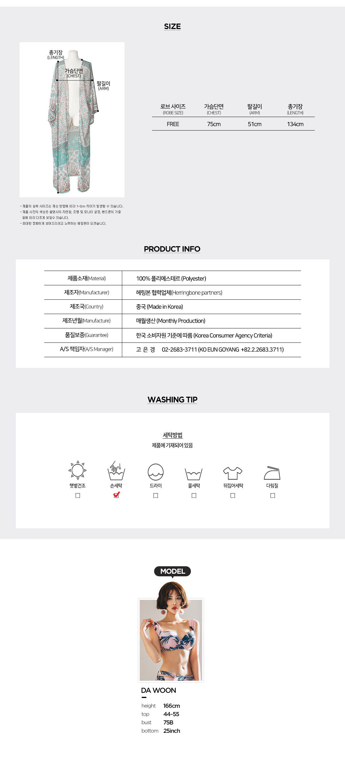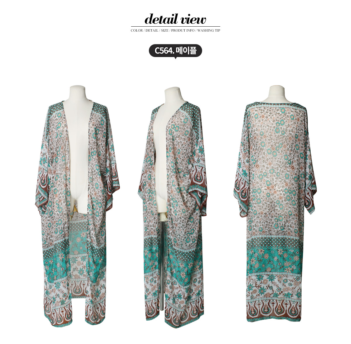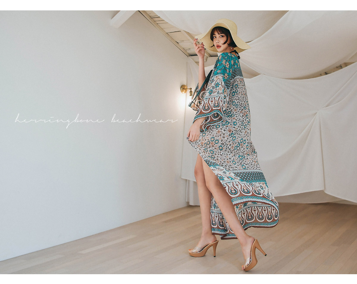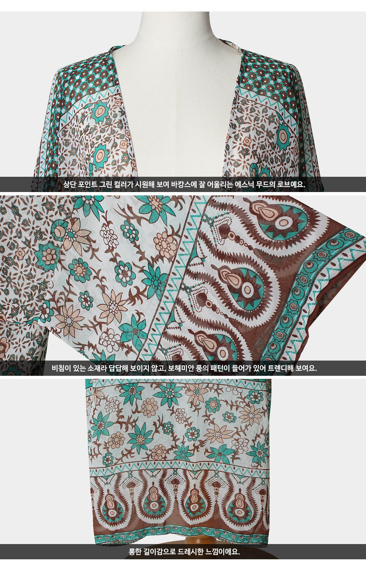 포인트 그린 컬러가 화사해 보이고 바캉스에 잘 어울리는 에스닉한 분위기의 로브예요.