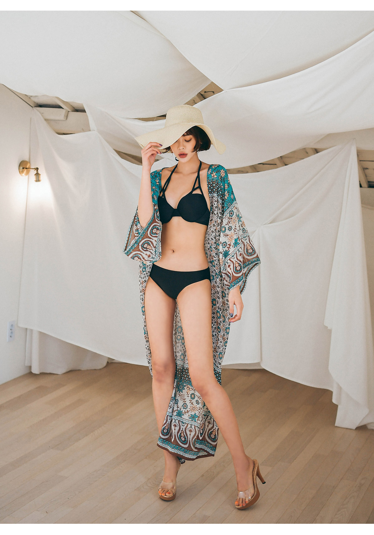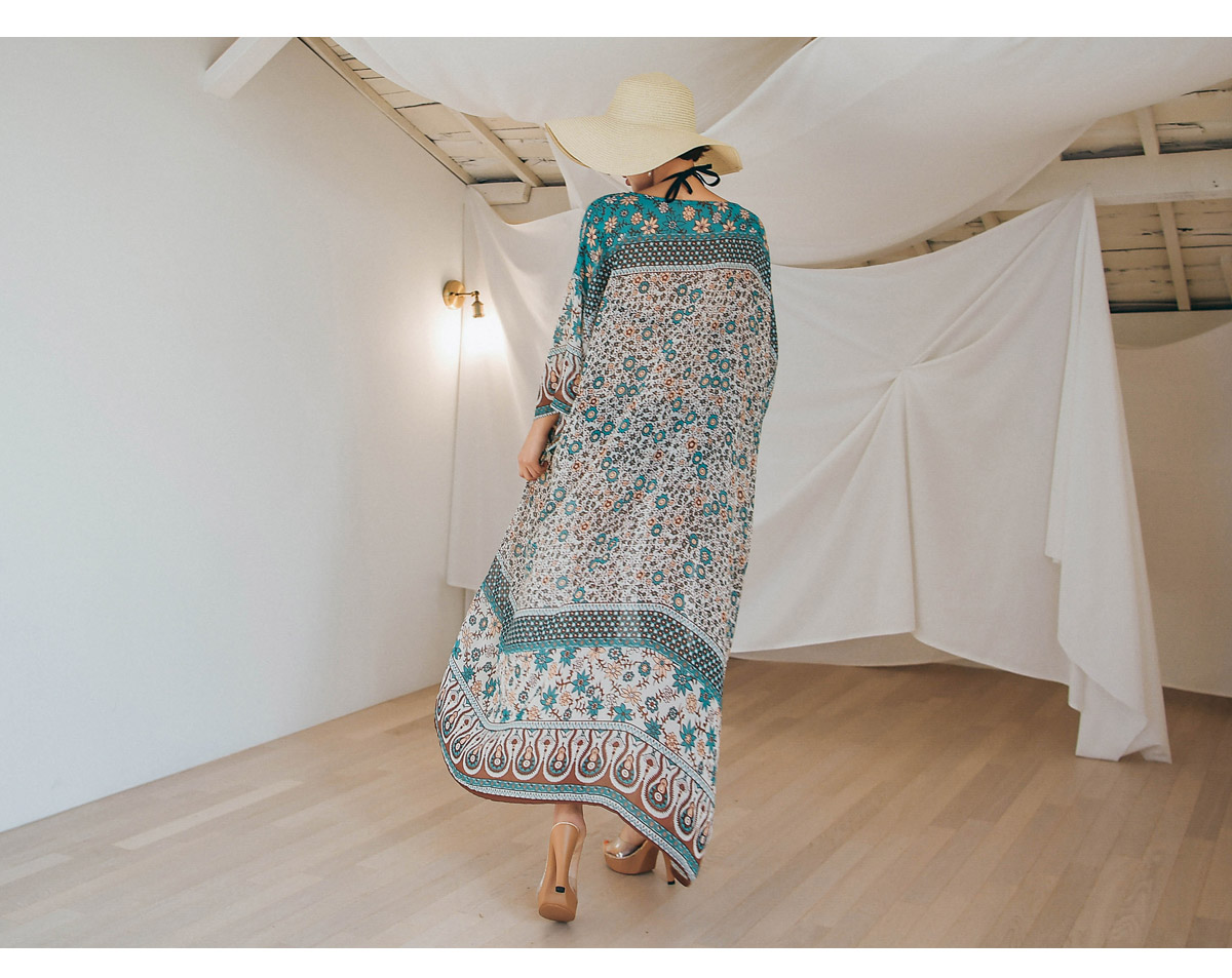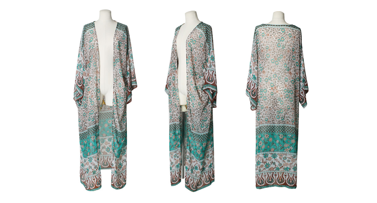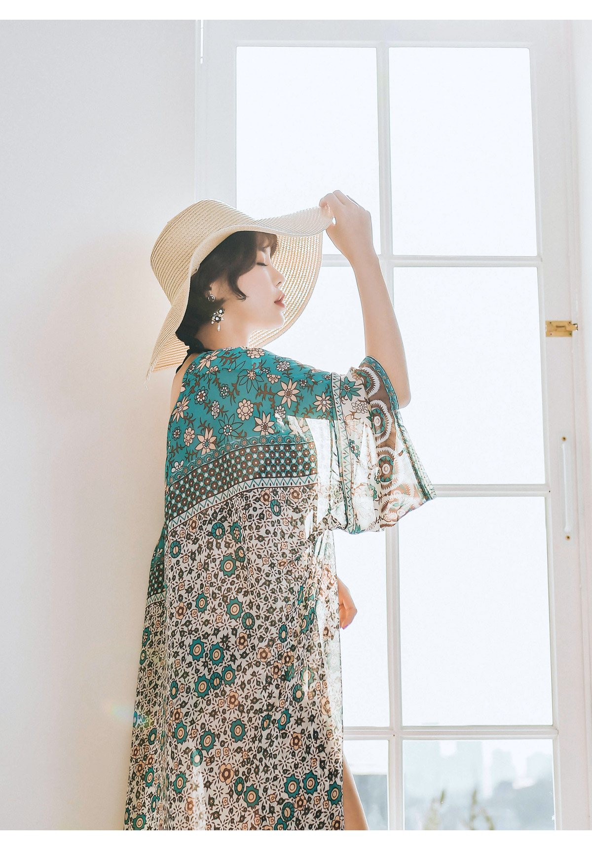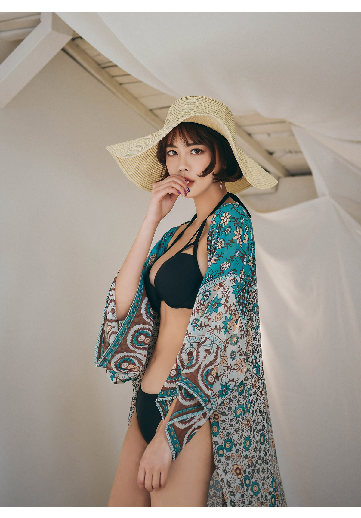 포인트 그린 컬러가 화사해 보이고 바캉스에 잘 어울리는 에스닉한 분위기의 로브예요.