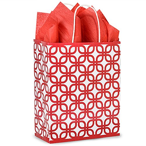 Studio : NW Publisher : NW Binding : Kitchen Product Description These Geo Graphics Red paper shopping bags are made from 100% recycled white kraft paper. Bags are 100% recyclable and are made with a minimum of 40% post consumer recycled content and carry the Green Way® logo. Made in the USA. These Rose sized bags measure 5-1/2in. x 3-1/4"in. x 8-3/8in. Tissue paper is not included. 250 Pack. 0