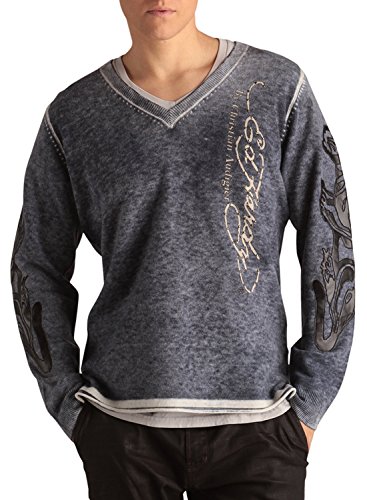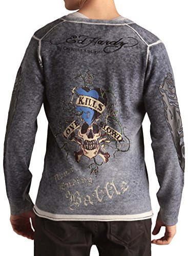 Binding : Apparel Product Description This Ed Hardy Men's Love Kills Applique Sweater Features: Knit throughout Long Sleeve V-neck Soft comfortable fit Sweater, Ribbed Collar and cuffs, Ed Hardy stitched logo print and Love Kills Slowly print at back with stud details, Ed Hardy logo at front with stud details, Faux leather applique on sleeves. 0