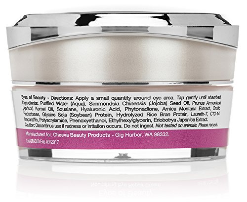 -. Binding : Misc. -. Brand : Cheeva Beauty -. EAN : 0820103892247 -. Feature : DOWN TO EARTH- Using only the purest Soybean and Rice Bran yeast proteins, we've created a time machine for your eyes! Poor microcirculation through your capillaries can cause clots and discoloration of the skin. These fantastic proteins help prevent blood from stagnating and strengthen collagen. For you that means brighter, and tighter skin! / NATURAL GOODNESS - The antibacterial, antiseptic and anti-inflammatory properties of Arnica Oil help in preventing inflammatory skin disorders. It can effectively heal the bruises that are caused by slow blood flow under your eyes, taking away that sad, tired look, leaving you looking invigorated. / LIGHTEN UP! - We tackle the dark circle problem from another angle using Jojoba Oil. While other ingredients work to heal the underlying problem, Jojoba works to lighten the skin, taking away that extra Melanin and evening your skin tone to help enhance your already radiant glow! / COLLAGENERATION - We want you to feel as good as you can for as long as you can, so we've given this amazing eye cream staying power by blending it with Hyaluronic Acid to not only firm and tone the skin, but give your eyes a stunning collagen boost. Anti-aging skin care at it's finest, from us to you! / FEEL YOUNGER OR BUST! - Either way, we've got your back with a 100% SATISFACTION GUARANTEE! You love our product or your money back, no questions asked. It's quality that sets us apart and allows us to make such a great offer. Let us give that to you risk free! -. Label : HealthMarket -. Manufacturer : HealthMarket -. MPN : EOB-1 -. PackageQuantity : 1 -. PartNumber : EOB-1 -. ProductGroup : Beauty -. ProductTypeName : BEAUTY -. Publisher : HealthMarket -. Studio : HealthMarket -. Title : Cheeva Beauty Under Eye Cream for Dark Circles, Fine Lines, Wrinkles, Bags & Puffiness - Collagen Booster Moisturizer w/ Hyaluronic Acid, Arnica, Jojoba Oil for Total Skin Rejuvenation -. UPC : 820103892247