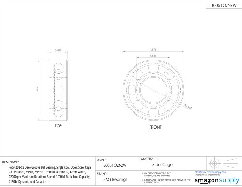 FAG 6203-C3 Deep Groove Ball Bearing, Single Row, Open, Steel Cage, C3 Clearance, Metric, Metric, 17mm ID, 40mm OD, 12mm Width, 22000rpm Maximum Rotational Speed, 1070lbf Static Load Capacity, 2150lbf Dynamic Load Capacity