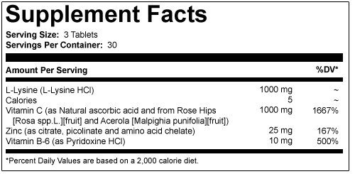 Description:L-Lysine 1000 mg, dietary supplement, with Vitamin C, B6 and Zinc. Naturally produced free-form amino acid. Solaray uses only 100% free form L-Lysine which contains no protein fragments commonly found in protein concentrates. Advanced Zinc Chelate is designed for optimum bioavailability. Size: 90ct 1000mg Directions:As an ADULT dietary supplement, take 1 Tablite one to three times daily. For best results, take with fruit juice between meals or just prior to eating. Serving Size: 3 Tablet 30 Servings per container Ingredients:Amount per serving:% Daily Value: + L-Lysine (L-Lysine HCl)1000 mgCalories5Vitamin B-6 (as Pyridoxine HCl)10 mg500%Zinc (as citrate, picolinate and amino acid chelate)25 mg167%Vitamin C (as Natural ascorbic acid and from Rose Hips Rosa spp.L.fruit and Acerola Malpighia punifoliafruit)1000 mg1667%Key to Ingredients: