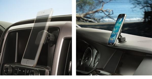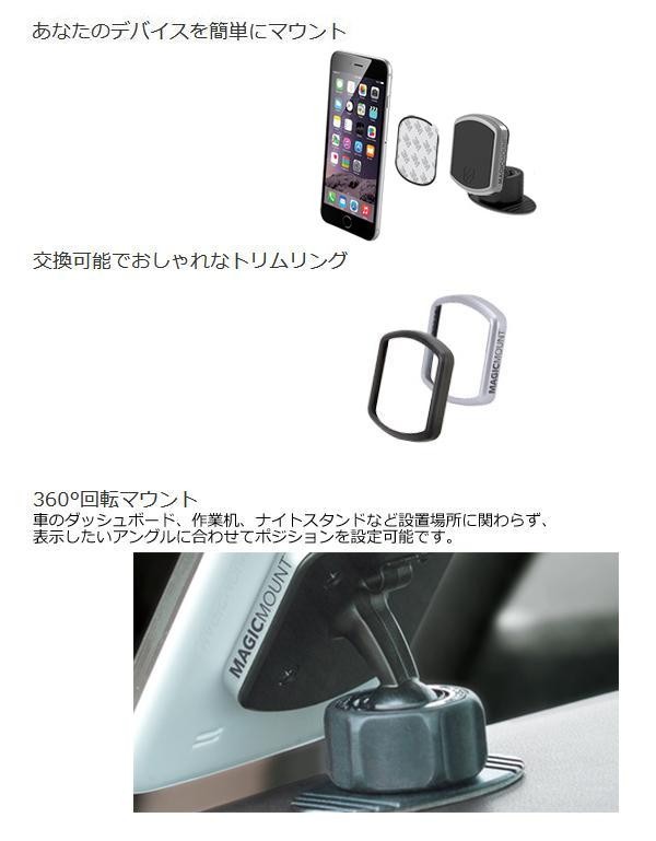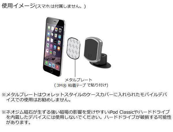 付属のメタルプレートをデバイスに直接貼り付けるか、ケースの内側か外側に貼り付けて使用します。ダッシュボードなどにスタンドを取り付け、磁石面の近くにデバイスを置くだけで固定されます。横置き・縦置きに合わせて、デバイスを自由なアングルで取り付けることが可能です。 |