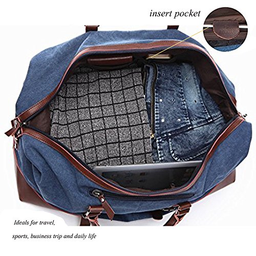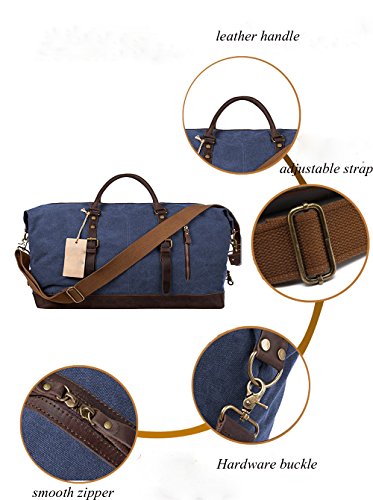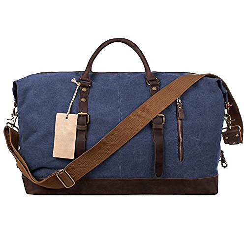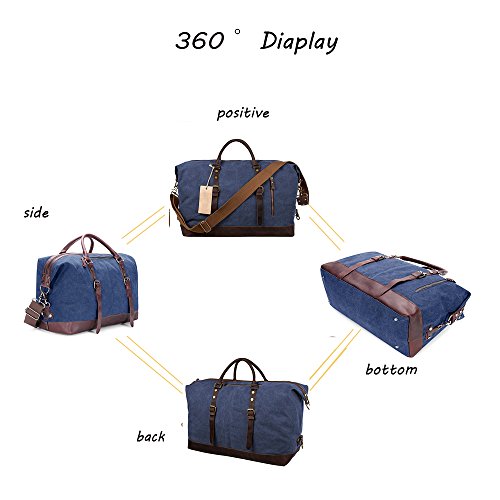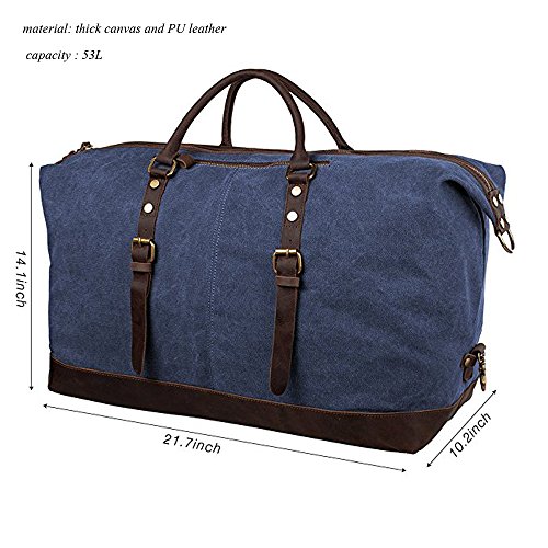 -. Feature : Material : The Duffel Bag was Made of a thick, top quality soft canvas and comfortable Genuine leather fabric, the durable bag offers reliable performance that stands up to everyday wear and tear. It can be carried on the hand or over the shoulder and smoothly opened and closed over and over without damage for its high-quality zippers. The duffel bag is classic military style Oversized / Dimension Size : 54* 33* 24 (cm)/21.3* 13* 9.4 (in )( L * H * W ) 2.54lb/1.15 kg / Structure : Functional inner pockets.2 inner pockets with zipper for Keeping precious items like purses, keys, money etc;2 phone slots; 1 front pocket with zipper for keeping passport; 1 top pocket with zipper for phone / Occasions : 3 days trip, travel, weekend activity, shopping, on a plane etc ,It is larger than a normal gym bag, but the size is perfect for a weekend bag or Long-trip