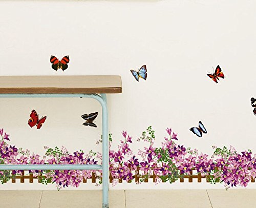-. Title : Dnven Purple Flowers Vines Blooms with Butterflies Fence Baseboard Stripe Border Wall Decals, Living Room Bedroom Removable Wall Stickers Murals