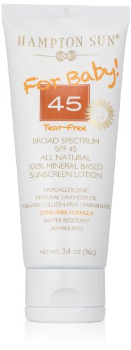 Our hypoallergenic, 100% mineral base SPF 45 Sunscreen Lotion uses all-natural, chemical-free SPF barriers zinc and titanium to provide a broad spectrum of UVA/UVB protection. Natural moisturizers like sunflower oil, lavender oil and beeswax keep skin soft and protected. Super gentle formula won’t sting eyes and cause tears! Water resistant for up to 40 minutes, Hampton Sun’s Natural SPF 45 Lotion for Baby is perfect for baby’s sensitive skin and for the whole family.