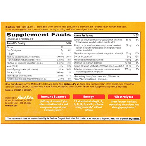 Includes 30 individual serving-size packets (0.32 oz. each) of Emergen-C Super Orange flavor fizzy drink mix