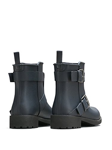Ankle-high rain boot with premium-leather lining featuring dual buckle straps at vamp and opening