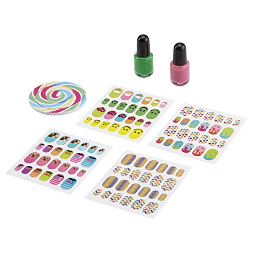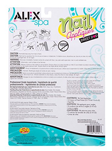ALEX Spa Nail Appliques Sweet Pop is a great way to get an adorable manicure! 96 stickers of images and patterns that would be impossible to create with just paint. Stick them on your nails, then file them down to perfectly fit for a trendy and cool look! Includes green and pink nail polish (0.17oz. /5ml. each), lollipop-shaped nail file and 96 nail stickers. Recommended for children 8 years of age and older.Feature