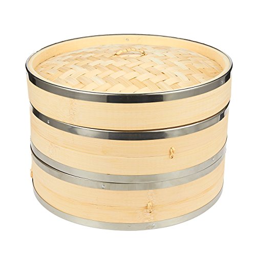 Cook and reheat your foods naturally while sealing in the nutrients using the Juvale Bamboo Steamer. Made from food-safe, 100% all-natural bamboo, this steamer is ideal for cooking vegetables, meat, seafood, poultry and more! It's also great for heating up meat, veggies, pasta, rice, and quinoa among other foods. Two-tier construction allows you to cook or reheat more items at the same time and steel rings improve the ability to trap in moisture. This Steamer has an inner diameter of 9.2 inches, an exterior diameter of 10 inches and a height of 6.2 inches.Feature
