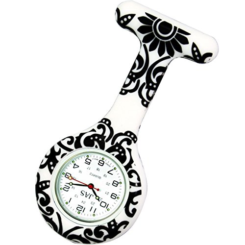 JAS Unisex Nurses Lapel Watch Silicone (Infection Control) Brocade Pattern - Black