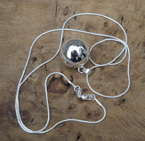 Each bell comes with a 60in long natural brown leather cord (which can be adjusted to sit perfectly over any growing bump) and a gorgeous 24in silver snake chain for use with your bola post birth