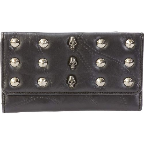 -. Feature : Snap-Fastened Front Flap, 3 Vertical Skulls & 12 Rivets - Gunmetal Finish / 1 Zippered Exterior Compartment with 3 Sections, 3 Interior Compartments / Transparent Driver's License Window, 14 Slots for Credit Cards / Matching Leather Zipper Pull, Fabric Lining / Measures 7-1/2" x 4-3/8" x 1-1/8"